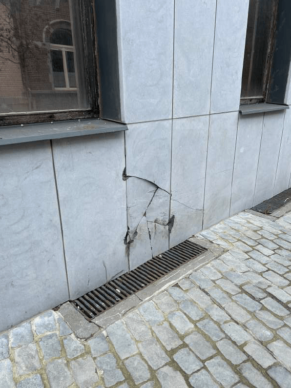 • La 1ère photo montre un impact sur la façade de la Rue Genard, à droite de la porte de garage. Il a été provoqué, avant le début du chantier de la Place Jules Destrée, par un véhicule non identifié et fait l’objet d’un suivi par le service des assurances de la Ville.