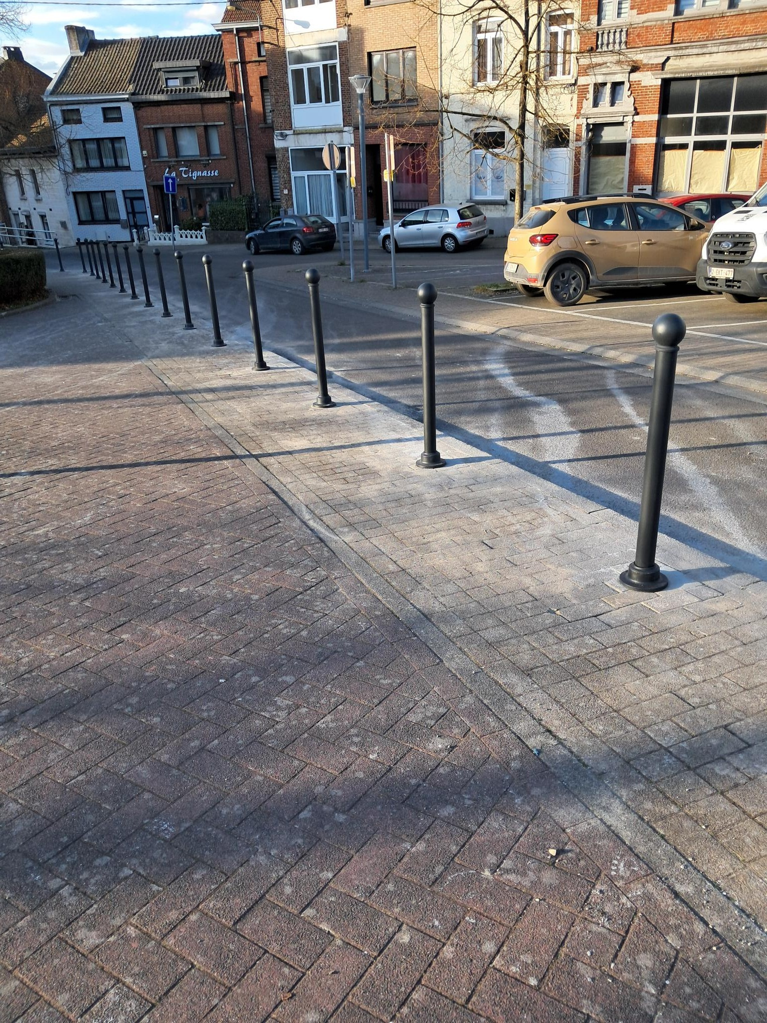 Il semblerait que la restauration des piquets bordant le fond de la place de Marcinelle-Centre ait commencé.